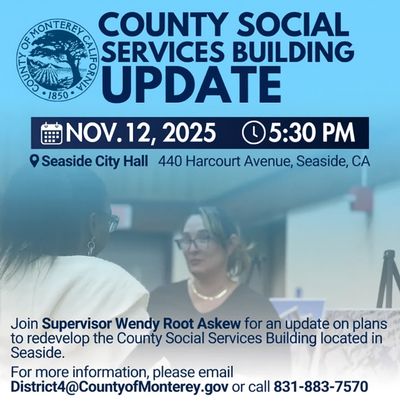 On September 3, 2025, Supervisor Askew held a special "Wednesdays with Wendy" at Seaside City Hall where she provided the community with an update on the County's plans to renovate the Department of Social Services building located on Broadway Avenue.